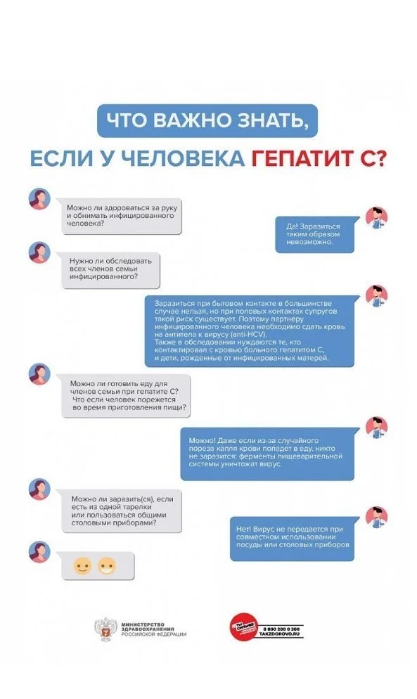 Вирус гепатита С не передается при рукопожатиях, объятиях, поцелуях, совместном использовании посуды и столовых приборов, общего постельного белья. / Если у кого-либо из членов семьи и/или совместно проживающих людей обнаружены антитела к вирусу гепатита С (anti-HCV) или РНК вируса гепатита С, всем остальным людям, у которых был риск инфицирования, необходимо сдать анализ крови на антитела к вирусу (anti-HCV) и РНК вируса гепатита С.